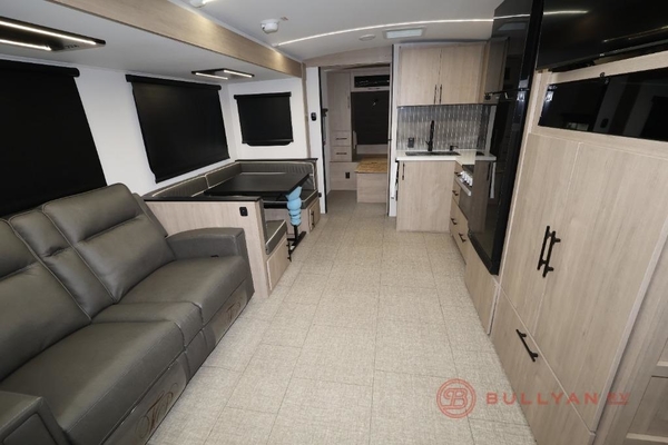 Experience the ultimate in comfort and convenience with this luxurious travel trailer. When you enter this trailer, you'll find convenient shoe storage to your right below the wardrobe/pantry. The full rear bathroom has a 30" x 36" shower with skylight for you to rinse off after you come in from an afternoon hike, and you can lounge on the tri-fold sofa or U-shaped dinette with removable ottoman after you are clean. The large slide creates more interior space, so you can cook freely on the three-burner range with oven in the kitchen, also, you can cook on the outside griddle. You'll have a private bedroom that you can retreat to at the end of a long day, and the 60" x 80" queen bed will provide comfort while you sleep.