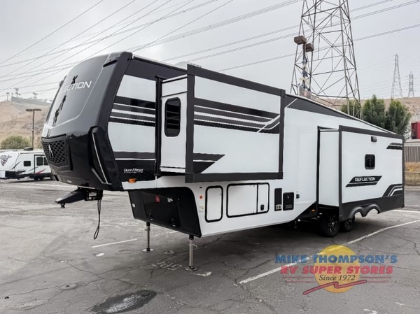 With any Reflection fifth wheel by Grand Design, you will have a solar panel for off-grid camping and a 60 amp charge controller and inverter prep, a Universal All-In-One docking station, unobstructed pass-through storage, and Goodyear Endurance tires. Each is constructed of gel coat exterior sidewalls, residential 5" truss rafters, walk-on roof decking, a fiberglass and radiant foil roof and front cap insulation plus laminated aluminum framed side walls, roof and end walls in slide rooms. Head inside to enjoy residential hardwood cabinet doors, premium Congoleum flooring, a spacious shower with a glass door, and many more comforts!