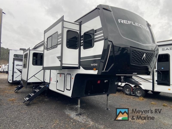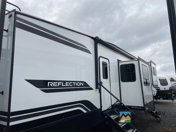 With any Reflection fifth wheel by Grand Design, you will have a solar panel for off-grid camping and a 60 amp charge controller and inverter prep, a Universal All-In-One docking station, unobstructed pass-through storage, and Goodyear Endurance tires. Each is constructed of gel coat exterior sidewalls, residential 5" truss rafters, walk-on roof decking, a fiberglass and radiant foil roof and front cap insulation plus laminated aluminum framed side walls, roof and end walls in slide rooms. Head inside to enjoy residential hardwood cabinet doors, premium Congoleum flooring, a spacious shower with a glass door, and many more comforts!