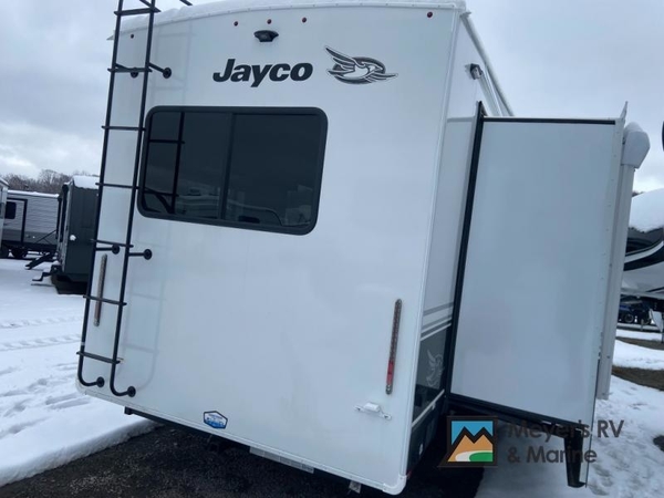 With any Eagle fifth wheel by Jayco you will appreciate durable construction materials, like the Magnum Truss Roof and the Stronghold VBL laminated walls. The JAYCOMMAND Smart RV system puts you in control of your RV's functions, and the 5 Star Handling Package will provide smooth towing from home to camp. Each model features Climate Shield zero-degree tested weather protection and the industry-exclusive HELIX cooling system that features two 15,000 BTU Whisper Quiet A/C's to keep you comfortable year around. Some of the exterior conveniences you are sure to love are the pass-through storage with Slam-Latch baggage doors and an automotive style front cap with max turn radius. The Eagle fifth wheels are designed to make you feel at home with solid hardwood slide fascia, residential vinyl flooring throughout, 100% no floor vents, and blackout roller shades with reflective side throughout for added privacy and insulation.