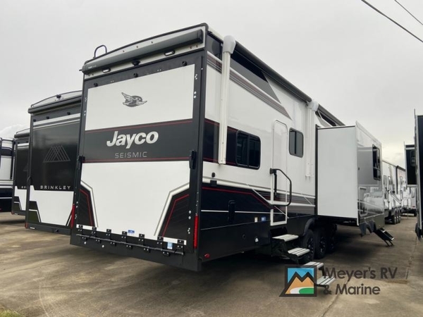 One look at the Seismic toy haulers by Jayco, and you'll never go back! Each model features a custom automotive-grade vinyl exterior graphics package, a painted fiberglass front cap with built-in LED lighting, and 102" wide-body structural steel I-beam construction. You'll find the pass-through storage with Slam-Latch baggage doors will make unpacking easier than ever, and the rear ramp door/patio with anti-slip, non-skid flooring will allow you to unload your toys with no trouble at all. These toy haulers feature a three seasons garage wall/doors, a 30 gallon fuel tank with a timer, and exterior marine-grade speakers to keep the party going. The Climate Shield zero degree tested weather protection includes a 35,000 BTU furnace, PEX plumbing, and a fully enclosed and heated underbelly so you can enjoy your adventures year around. And we haven't even touched on the interior luxuries you'll find, like solid hardwood cabinet doors, residential vinyl flooring made in the USA, night shades, and more!