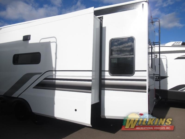 A perfect fifth wheel featuring triple slides and a tri-fold sofa for overnight guests! You will love the spacious interior thanks to the dual opposing slides in the main living and kitchen area. Here you will find a kitchen island in the center and plenty of seating with a free standing dinette, theater seating for movie night opposite the fireplace and entertainment center, as well as a tri-fold sofa. The kitchen offers all of the amenities just like home, a 16 cu. ft. 12-volt refrigerator for your perishables, and a hutch with an electronics drawer to keep your gadgets organized. There is even a pet dish under the refrigerator for your furry friends. The spacious full bath includes a 48" x 30" shower, dual linen closets, and an accessory drawer for necessities. You'll love the front bedroom with its queen bed slide out, slide top dresser, front wardrobe with washer and dryer prep, plus a pass-thru clothes hamper between the bedroom and bath; how convenient!