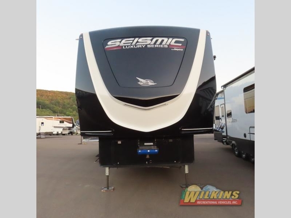 With any Seismic Luxury Series fifth wheel toy hauler by Jayco, you will enjoy the versatile garage that offers a rear ramp door and patio with anti-slip, non-skid flooring, a Tuff-ply, rubberized garage floor liner, and the Industry's first 2" block-foam fully insulated garage floor. The mandatory 5 Star Handing package gives you MORryde CRE-3000 rubberized suspension, Dexter axles with Nev-R-Adjust brakes, E-Z Lube hubs and 4,000 lb. leaf springs, and a MORryde pin box and more. More standout features include the Tire Pressure Monitoring system, the wireless remote control system which includes Bluetooth wireless interior controls, the fresh water drinking system, and the list goes on and on! Choose a Seismic Luxury Series because there isn't anything better!