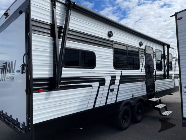 You will love this Momentum MAV toy hauler travel trailer! The front bedroom features a queen bed, and there is plenty of room to walk around. The sliding solid bedroom door helps with space. Overhead storage and a pair of nightstands are convenient storage, plus there is a wardrobe with both drawers and space to hang items. The kitchen offers a microwave, stainless steel sink, and an 8 cu. ft. 12V refrigerator. In the garage, you'll find rollover sofas with a table and a top bed for guests to sleep on. The ramp door/patio will provide additional living space once your toys are unloaded, and the pull down screen will keep bugs out!