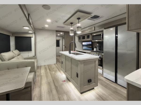 Finding the perfect trailer for a larger group is simple with this Reflection! The rear bunkhouse might be the first reason you fall in love because of the slide out with a flip top bunk above a tri-fold sofa, a second bunk bed with a window on the opposite side and storage below, and the large rear window for great views. The outside kitchen might be another reason allowing you to enjoy the outdoors while providing meals for everyone, and/or the inside gourmet kitchen with a 16-cu. ft. refrigerator, an island, and additional storage space. Everyone can gather together and relax on the theater seating with cupholders and the booth dinette across from the entertainment center and fireplace. An optional tri-fold sofa can be chosen in place of the theater seat, and an optional free-standing dinette can be chosen in place of the booth dinette if you prefer these seating options. The full bathroom includes a space savings sliding door and linen storage, and the bedroom gives you a front walk-around queen bed with storage for your clothes, plus there is an additional wardrobe with washer and dryer prep if you choose to add these appliances.