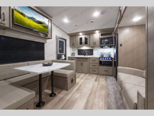 This rear kitchen fifth wheel is sure to meet all of your camping needs! Since the exterior length is only 26' 11", you can easily maneuver in and out of campgrounds. The rear kitchen includes ample counter space to prep meals, a three burner cooktop, and overhead storage for all your necessities. There is a 10 cu. ft. 12V refrigerator within the slide out that also includes the theater seating, and the U-shaped dinette provides a place to dine or play a card game. You will appreciate having convenient storage by the entry door, along with pull-out pet bowls, a functional wardrobe closet in the bedroom and an exterior pass-thru for belongings and camping gear. When you're ready to turn in for the night, the queen bed is sure to bring a great night's rest, while your guests sleep on the booth dinette or optional tri-fold sofa if you replace the theater seating!