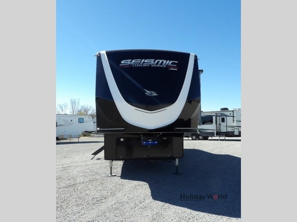 With any Seismic Luxury Series fifth wheel toy hauler by Jayco, you will enjoy the versatile garage that offers a rear ramp door and patio with anti-slip, non-skid flooring, a Tuff-ply, rubberized garage floor liner, and the Industry's first 2" block-foam fully insulated garage floor. The mandatory 5 Star Handing package gives you MORryde CRE-3000 rubberized suspension, Dexter axles with Nev-R-Adjust brakes, E-Z Lube hubs and 4,000 lb. leaf springs, and a MORryde pin box and more. More standout features include the Tire Pressure Monitoring system, the wireless remote control system which includes Bluetooth wireless interior controls, the fresh water drinking system, and the list goes on and on! Choose a Seismic Luxury Series because there isn't anything better!