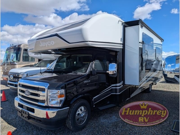 With any Greyhawk Class C gas motorhome by Jayco you will experience smooth sailing thanks to the JRIDE PLUS that comes with Koni shock absorbers, a computer-balanced driveshaft, Hellwig helper springs, and more. The Ford E-450 chassis with a 7.3L V8 325 HP engine will power your excursions, and you'll appreciate the added safety features for your peace of mind. Each model features a Sony infotainment center with Apple CarPlay and Android Auto, backup and side-view cameras, and a tire pressure monitor system the driver is sure to appreciate. Durable construction begins with Stronghold VBL roof, floor and sidewalls, bead-foam insulation, and a one-piece seamless fiberglass front cap. Head inside to find blackout night roller shades, LED-lit pressed countertops, an 84" interior ceiling height, and hardwood cabinet doors and drawers.