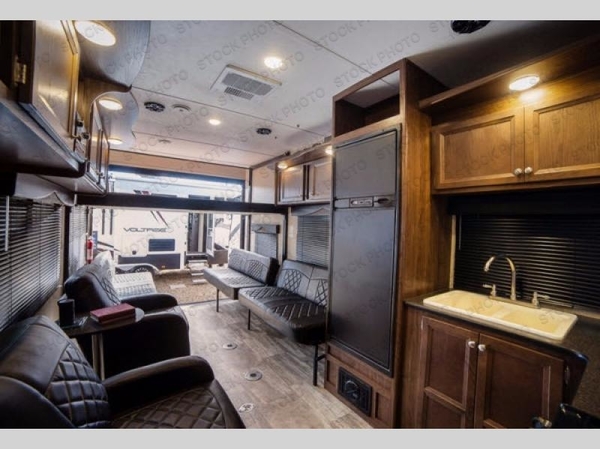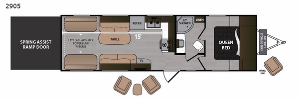 Load your toys and gear easily with the rear ramp spring assist door. Once inside the cargo area you will find dual rollover sofas with an optional HappiJac power bunk above that stores neatly up at the ceiling when not in use. This allows for the whole gang to sit and relax and catch their breath before the next ride, plus it adds more sleeping space at night.