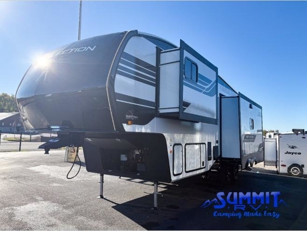 With any Reflection fifth wheel by Grand Design, you will have a solar panel for off-grid camping and a 60 amp charge controller and inverter prep, a Universal All-In-One docking station, unobstructed pass-through storage, and Goodyear Endurance tires. Each is constructed of gel coat exterior sidewalls, residential 5" truss rafters, walk-on roof decking, a fiberglass and radiant foil roof and front cap insulation plus laminated aluminum framed side walls, roof and end walls in slide rooms. Head inside to enjoy residential hardwood cabinet doors, premium Congoleum flooring, a spacious shower with a glass door, and many more comforts!