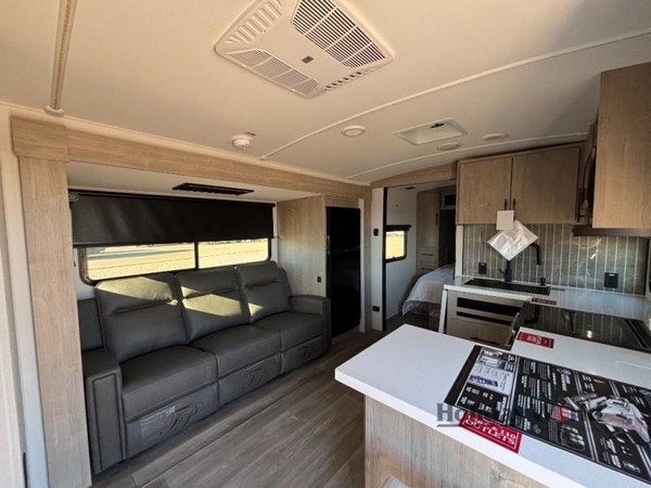 Unleash adventure with this incredible travel trailer! Sleep in style in the serene bedroom, featuring a plush queen bed, spacious wardrobe, and TV prep for entertainment. The kitchen is equipped with a pull-out pantry, 10 cu. refrigerator, microwave, and three-burner cooktop for delicious meal prep. Enjoy extra counter space with the flip-up countertop extension, optimal for easy and comfortable cooking. Family and friends can dine at the U-shaped dinette while watching the  LED HDTV for added entertainment. The full bathroom offers a shower, and linen closet. Kids will love the double bunk bed, perfect for taking a nap. On the exterior, you will find the outdoor kitchen, pass-thru storage, and 20 x 20 baggage door/trash can storage, ideal for a better organization of your belongings. Finally, create outdoor activities without worrying about the weather thanks to the 19 awning.
