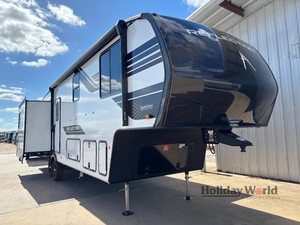 With any Reflection fifth wheel by Grand Design, you will have a solar panel for off-grid camping and a 60 amp charge controller and inverter prep, a Universal All-In-One docking station, unobstructed pass-through storage, and Goodyear Endurance tires. Each is constructed of gel coat exterior sidewalls, residential 5" truss rafters, walk-on roof decking, a fiberglass and radiant foil roof and front cap insulation plus laminated aluminum framed side walls, roof and end walls in slide rooms. Head inside to enjoy residential hardwood cabinet doors, premium Congoleum flooring, a spacious shower with a glass door, and many more comforts!