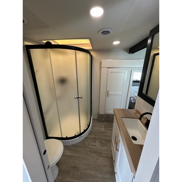 Step inside and youre greeted by soft lighting, warm wood tones, and modern black stainless finishes. Imagine sipping coffee beside a glowing 5,000 BTU fireplace, while morning light spills through panoramic windows and a gentle breeze drifts through the cross-ventilated bedroom.