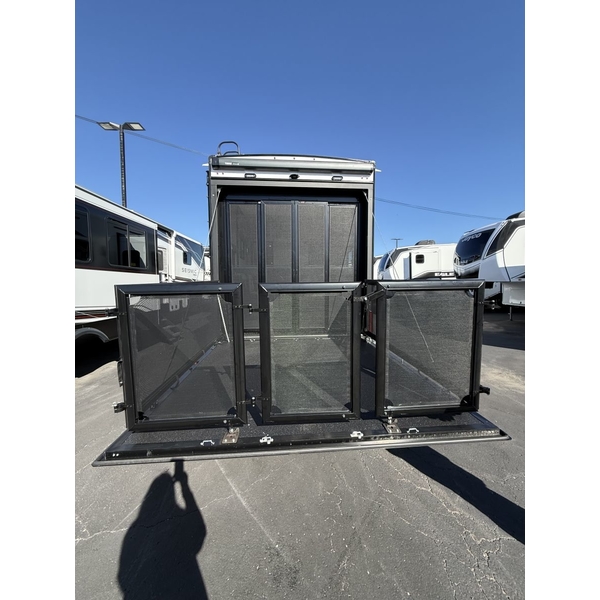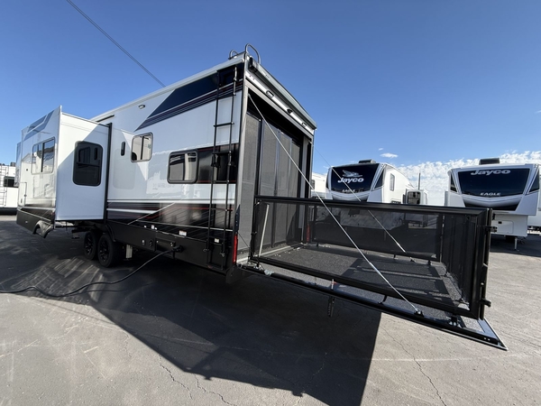 The garage is built for versatility, featuring HappiJac® electric-lift queen beds/convertible sofas, a Tuff-ply rubberized floor liner, and three-seasons removable wall/doors. Outdoor living is maximized with a rear ramp patio kit, anti-slip flooring, and a rear electric patio awning. Select models also offer an outside HALO griddle with JayPort® LP quick-connect.
