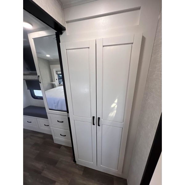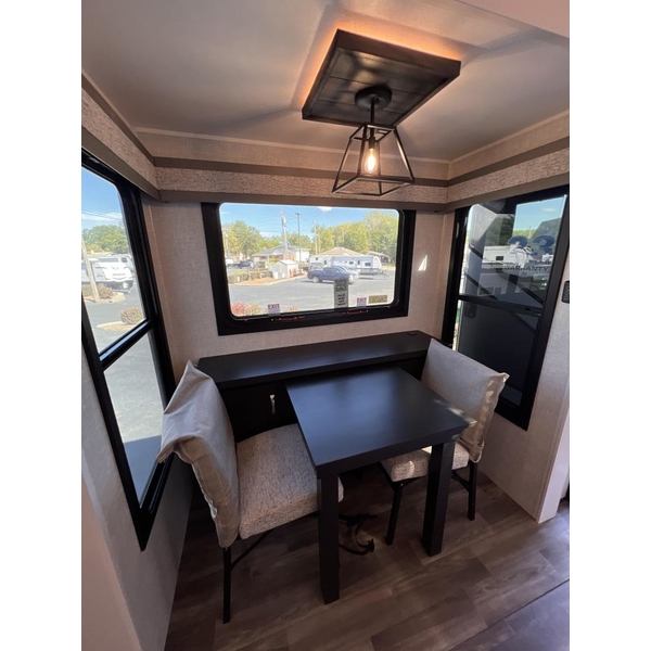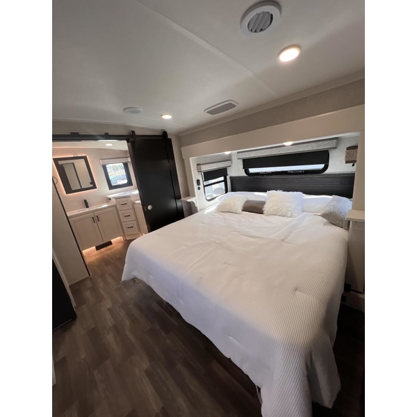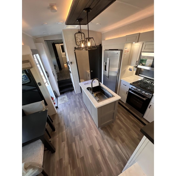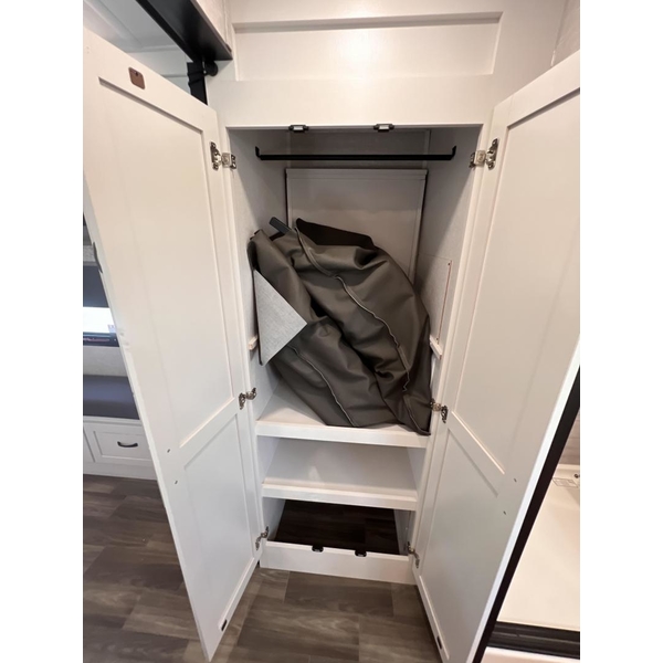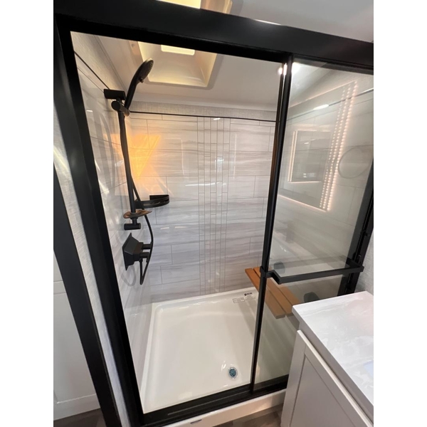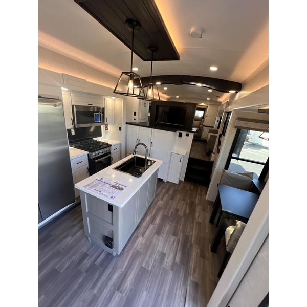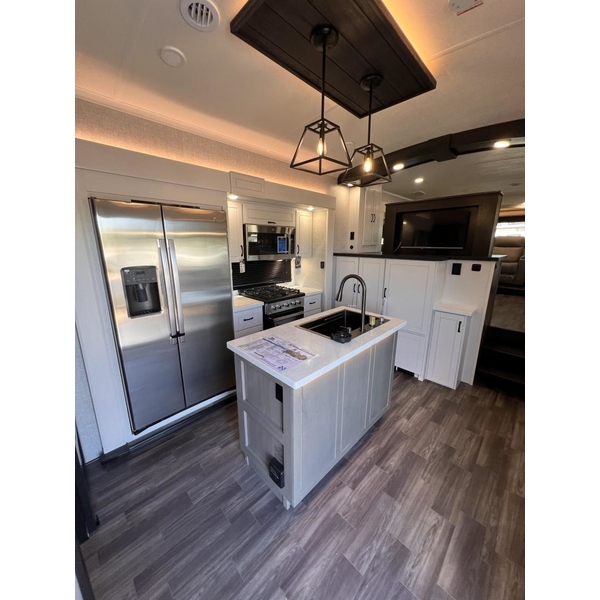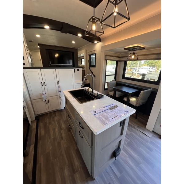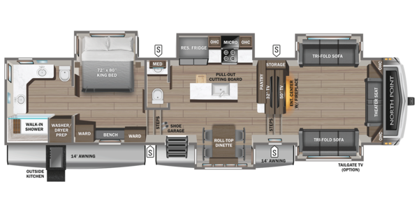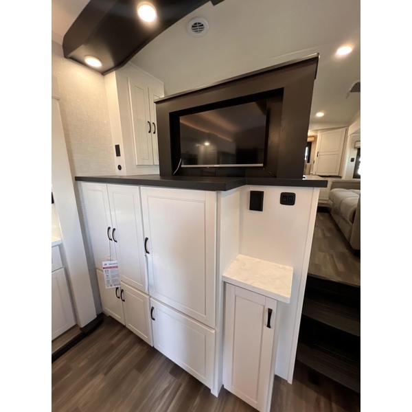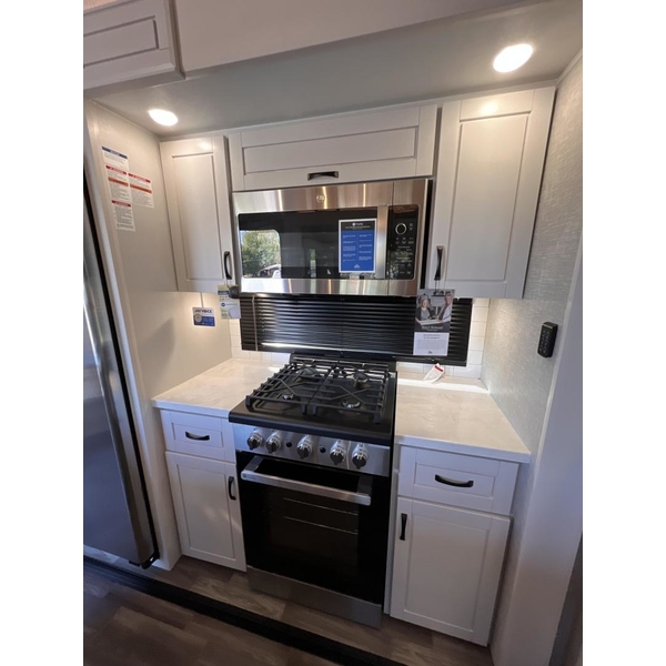 Inside the North Point, residential features abound, including GE Profile appliances a GE 21 cu. ft. residential refrigerator with an 1800W inverter, GE Profile Series 30 in. residential convection microwave with built-in air fryer and a residential 24 in. range. These residential appliances provide convenience that mirrors the ease of cooking at home. An added bonus is the built-in microwave air fryer, reducing the need for one more small appliance to clutter the counter space. The kitchen also features a new flip-up island countertop extension and pull-out utility storage under the sink (most models) for extended workspace for cooking, entertaining or serving food.