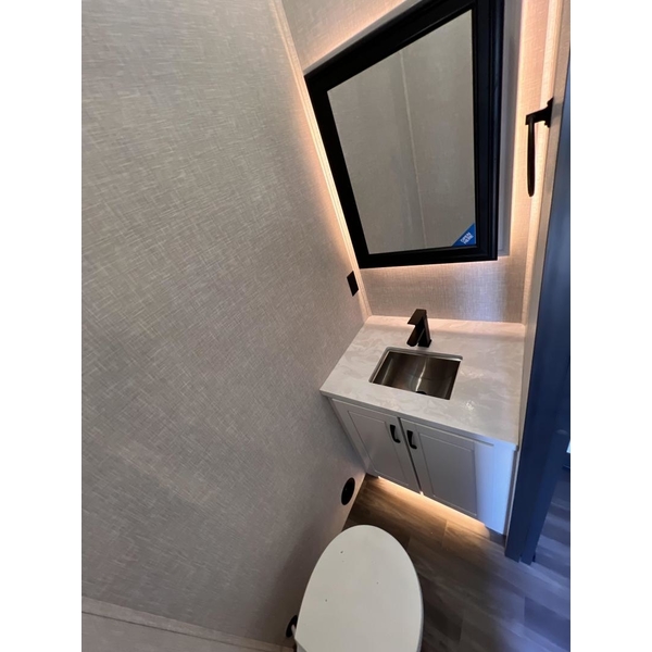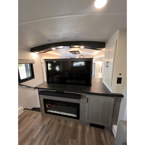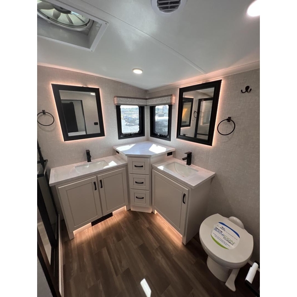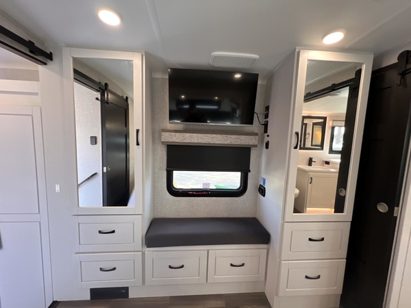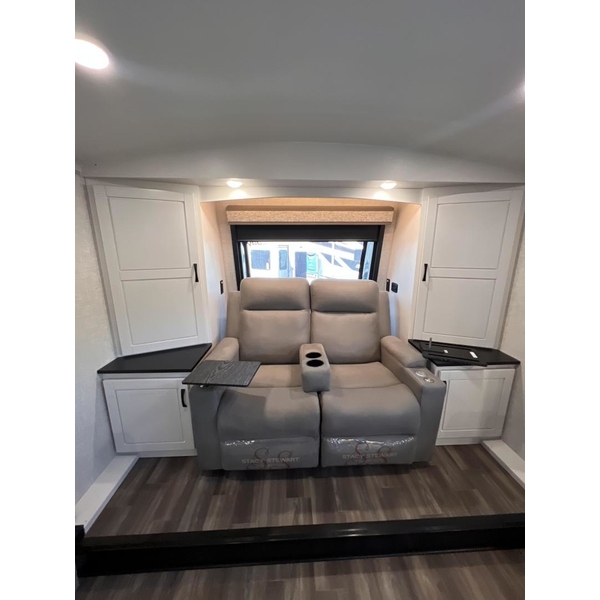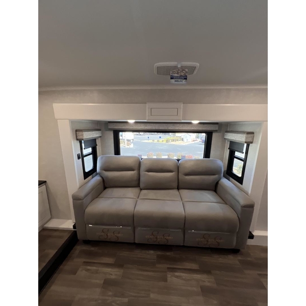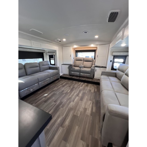 While driving down the road, the 102 wide-body design of our Jayco Luxury Fifth Wheels may feel substantial, but you'll appreciate the extra living space and storage once youre set up at camp. To enhance safety and convenience, all models are prewired for the optional Furrion® backup camera, side view observation, and security monitor system. This system works reliably even at highway speeds and is tested for extreme climates and vibration resistance, providing peace of mind for changing lanes, merging, and backing up. For added security, there is additional camera prep at the front entrance door and an internal security camera switch in the bedroom, allowing you to monitor your surroundings at night. You'll enjoy a safer and more secure camping experience with the advanced features of Jayco Luxury Fifth Wheels.