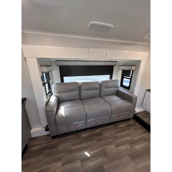 The North Point has all the basics covered, as well. Three, 40-lb. LP bottles mean less trips to fill propane, unlike the regular two, 30-lb. bottles other manufacturers provide. The new Nuvo H20 Whole-house, three-cartridge system in the pass-through storage provides purified drinking water and ice. Relaxing in your beautiful coach is even more enjoyable with the North Points HELIX Cooling System with its advanced design on A/C ducts and vents ensures a peaceful and comfortable environment. The result of the improvements is a curved, helix-shaped system to go along with the residential air return system. This system maximizes air flow out of the main A/C unit, making for a more efficient system than most competitors. New for this year, the residential dovetail-jointed drawers and residential built-in sink with glass cleaner and vegetable rinse are easy to use and feel like home.