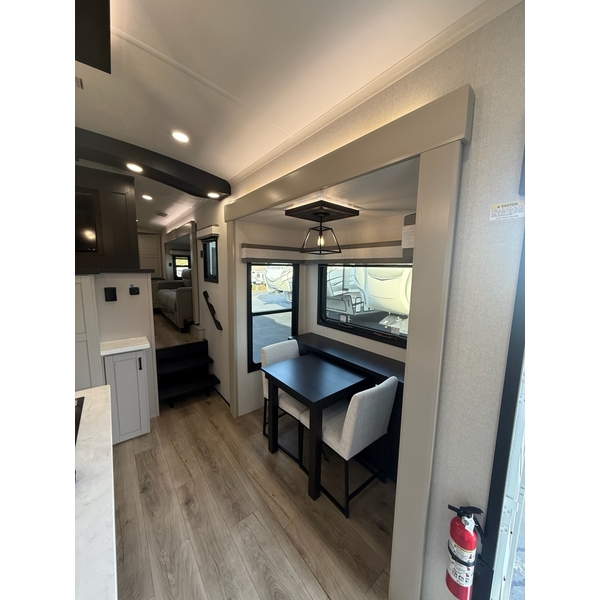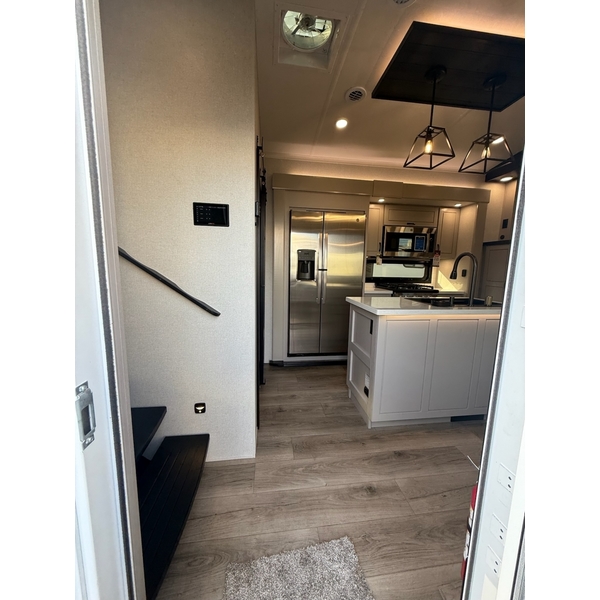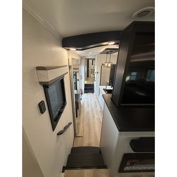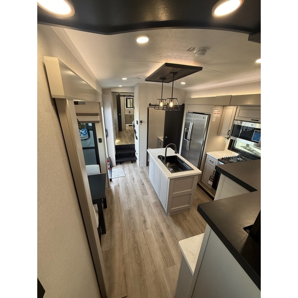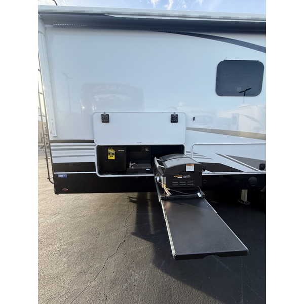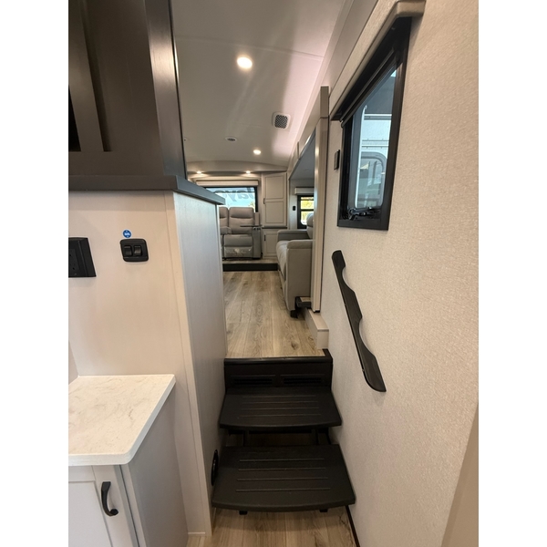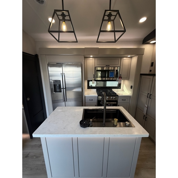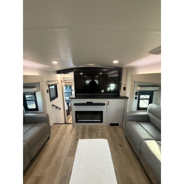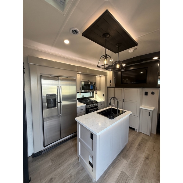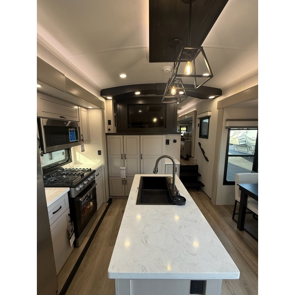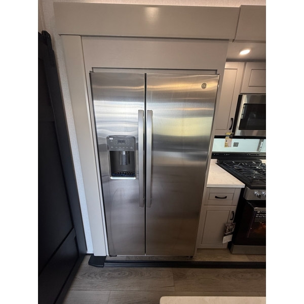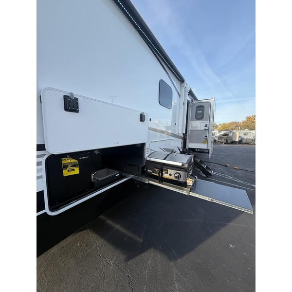 At camp, the 102-inch wide-body frame opens up to reveal a spacious interior rich with residential-grade finishes. Culinary conveniences abound with GE® Profile appliances, including a 21-cu. ft. refrigerator, 30-inch convection microwave with air fryer and a 24-inch gas rangebringing the full kitchen experience on the road. Relax in style with true residential furnishings, a JBL® sound system with subwoofer and a cozy electric fireplace, all designed for ultimate comfort and downtime.