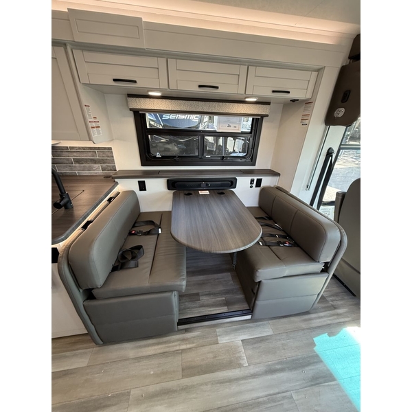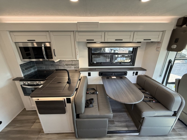 Inside, theres plenty to love. The Jayco-exclusive, easy-operation legless dinette table is built strong so it wont sag during meals or game night. It also quickly converts into a bed for extra sleeping space. Seatbelts in every seating position and child safety tethers in the dinette keep everyone safe during travel. In the kitchen, the residential-size microwave lets you cook your favorite meals from home, even while youre on the road.