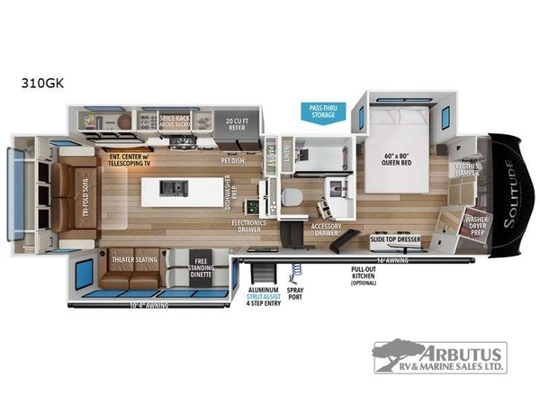 Traveling for long periods at a time is made easy with this gourmet kitchen that can feed your entire group a holiday meal! The professional-grade stainless steel cooktop with a built-in oven, microwave, 20 cu. ft. refrigerator, and a kitchen island offers everything you will need to enjoy cooking for your family and guests. There is abundant storage throughout multiple overhead cabinets, a kitchen pantry and a bath linen cabinet for your towels, and in the front master bedroom which features a large closet. In the bedroom there is also a queen bed slide for added space to sleep comfortable at night, or you may choose an optional king bed if you enjoy more space. You will also find a closet with washer/dryer prep, large wardrobe, clothes hamper plus a slide top dresser. Two nice awnings will provide outdoor living space keeping you protected from the sun and rain, and you can add an optional pull-out kitchen to enjoy convenient cooking outdoors as well.