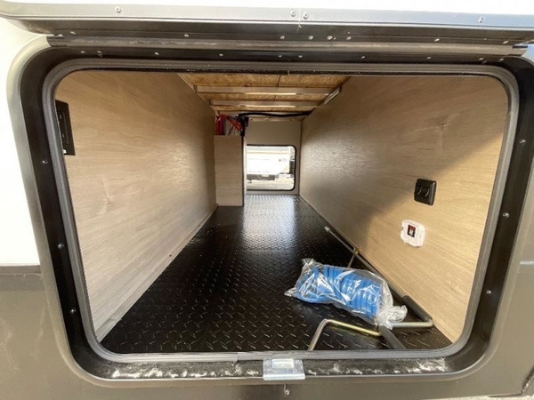At the front of the 2700BS trailer, youll find a spacious full bedroom featuring a 70" x 80" king bed housed in one of two slide outs, offering both generous space and a comfortable nights rest. The room also includes a wardrobe and dresser, providing ample storage for clothing and essentials. Moving toward the center, the walk-through bathroom boasts a 30" x 36" residential walk-in shower with a skylight, a toilet, and a sink opposite a mirrored medicine cabinet for added convenience and storage. At the rear, the open-concept kitchen and living area make excellent use of the second slide out, which includes cozy theater seating, perfect for dining or relaxing while watching TV. Next to it sits a 10-cu. ft. refrigerator, offering plenty of room for groceries and refreshments. Across the space, the L-shaped kitchen spans the entire rear wall, giving you extensive countertop room for meal prep. Equipped with a three-burner range, oven, microwave, and stainless steel sink, this kitchen allows you to cook in comfort and style without relying on campsite facilities.