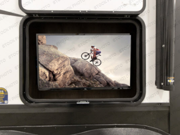 You won't believe all that this fifth wheel has to offer! From the rear desk with overhead cabinets for you to get some work done while you're away to the front private bedroom with a queen bed, which can be switched for the optional king bed, and a full wall wardrobe that is prepped to add the optional washer and dryer. The kitchen island will make your meal prepping easier and if you choose to add the optional free standing dinette then it will come with ottoman storage to keep your games. The living area is a comfortable place to wind down your nights with the tri-fold sofa that has a hutch behind it and the theater seating directly across from the entertainment center with the 40" HDTV and fireplace below. The exterior is decked out in features you will love like the outside kitchen with a two burner cooktop, two power awnings, an outside entertainment center with a LED TV, a spray port, an all-in-one docking station, and an unobstructed pass-through storage area!