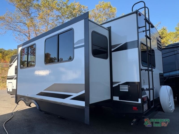 How does a desk with a view sound in your next travel trailer? You can work remotely or check your social media from the desk which is next to the pantry so you can easily grab a snack whenever you like. And your best friend can be eating from the pet dish under the refrigerator. The cook will enjoy having the kitchen island to prepare and serve meals as well as dry dishes next to the sink. They might like to make a few meals on the outside kitchen and store extra drinks in the 1.6 cu. ft. outdoor refrigerator. Everyone else can relax under the 21' power adjustable awning. Inside there are two slides outs in the living and kitchen area offering a spacious place to relax on the tri-fold sofa and booth dinette while watching the telescoping 40" TV with fireplace below before getting cleaned up in the full bathroom. And the master suite with a walk-around queen bed and lots of clothing storage will be calling your name after a fun day exploring outdoors, working, and/or visiting with other RVers.