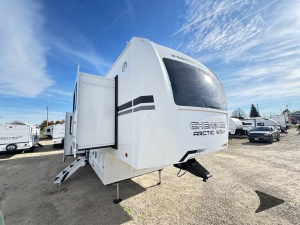 You will have amazing residential comfort in the Forest River Cherokee Arctic Wolf fifth wheels! These bed slide units have a SuperStor basement storage compartment to allow you to bring more gear, and they have been constructed with a ToughBend rigid skirt metal design, a 1x engineered wood SuperTruss roof structure with 3/8" decking, and a 5/8 tongue-and-groove plywood floor decking. Each model includes Leash Latch pet safety technology, an outside shower with hot/cold water, preparations for an exterior TV. The supersized central air conditioning unit (15,000 BTU) with quick cool and second oversized 15,000 BTU ducted A/C will cool your unit down in a snap when you camp in the hot summer months.