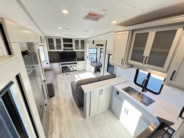 Live the high life with a Keystone Montana High Country fifth wheel! You'll have all the luxury you need with these units. They come with a MaxTurn front cap with KeyShield automotive-grade paint, a fully walkable roof with Alpha seamless TPO membrane system, and an insulated underbelly with forced hot air and electric tank heaters. The MORryde CRE3000 suspension with wet bolts helps provide a smooth tow, and the Ground Control® four-point electric auto-leveling with hitch memory will make set-up quite easy. The interior is elegantly appointed with the Thomas Payne Collection furniture, hardwood decorative slide-out fascia, Beauflor® vinyl throughout, accent crown molding, and premium solid surface kitchen countertops.