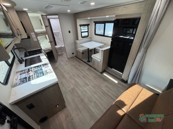 This travel trailer has everything you need for a great vacation! You will never miss home when you see all of the amenities included on this trailer. There is a full bathroom for easy morning routines, a set of 47" x 76" double over double-size bunks with privacy curtains for compact sleeping, a U-shaped dinette for meal times, and a full kitchen with all of the appliances needed for filling meals. You could even switch out the dinette for an optional theater dinette. The front Murphy bed not only provides versatility with a bed to sleep on at night, and a seating area during the day, but also a removable interior/exterior table. In addition to all of that, you'll also find an outdoor griddle and 1.6 cu. ft. refrigerator that you can use when the weather is nice. The unobstructed pass-through storage will be able to store your fishing poles and sports equipment while you travel.