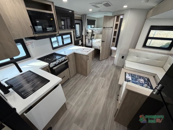 Unleash adventure with this incredible travel trailer! Sleep in style in the serene bedroom, featuring a plush queen bed, spacious wardrobe, and TV prep for entertainment. The kitchen is equipped with a pull-out pantry, 10 cu. refrigerator, microwave, and three-burner cooktop for delicious meal prep. Enjoy extra counter space with the flip-up countertop extension, optimal for easy and comfortable cooking. Family and friends can dine at the U-shaped dinette while watching TV for added entertainment. The full bathroom offers a shower, and linen closet. Kids will love the double bunk bed, perfect for taking a nap. On the exterior, you will find the outdoor griddle and a small refrigerator, pass-thru storage, and 20 x 20 baggage door/trash can storage, ideal for a better organization of your belongings. Finally, create outdoor activities without worrying about the weather thanks to the adjustable power awning with LED lights
