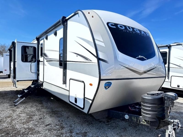 The Keystone Cougar Half-Ton fifth wheel and travel trailers are known as one of America's favorites for a reason! Some of those reasons are the exclusive features that come from Keystone, like the Winegard Air 360+ omni-directional rooftop antenna, the in-floor heating ducts, and the Hyper Deck flooring. The Cougar Half-Ton has a Climate Guard protection package to keep you safe during inclement weather, along with two roof attic vents, PEX plumbing and more. Use the 17" Furrion range with Piezo ignition to create all of those familiar meals from home, and enjoy endless hot showers with the Girard tankless on-demand water heater!