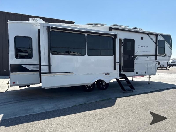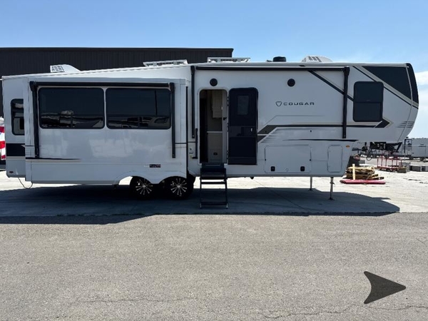 Youll love camping in this spacious Cougar fifth wheel with its triple slides and inviting rear living layout. Relax on the tri-fold sleeper sofa or theater seating while enjoying the entertainment center with fireplace. The kitchen has everything you need to prepare meals, including a center island with sink and plenty of counter space, plus a 21" range, microwave, and residential-size pantry. A free-standing dinette provides the perfect spot to enjoy meals or a late-night game.