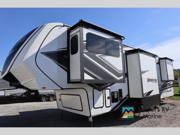 With any Momentum M-Class toy hauler by Grand Design, you will enjoy luxury at every turn! They have been constructed to a superior standard with a thermal roof design, triple insulated main floor and garage floor, and a Rail-Tite underbelly seal that will allow you to camp in all elements. Each model also features a, 8' 5" wide body chassis with a wide rail design, no wheel wheels, and a dovetail entry for easier loading. The Stealth A/C system provides maximum cooling power, and the CRE3000 suspension system means you can enjoy a smooth tow each time. You will love the luxurious interior with a professional grade stainless steel cooktop, interior color changing LED accent lighting, a fiberglass shower with a glass door, and solid surface countertops.