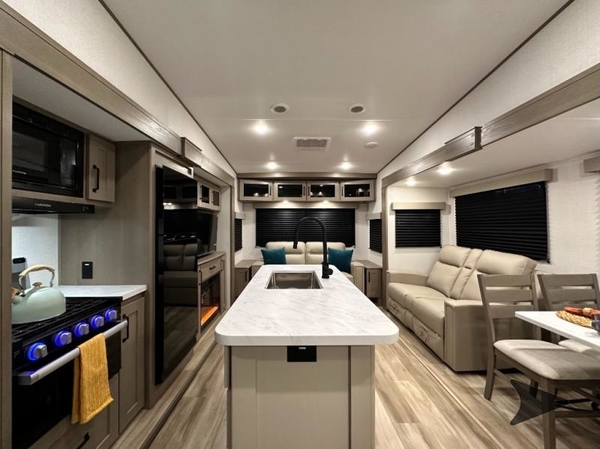 You'll love the amount of space you have in this fifth wheel thanks to the dual opposing slides in the rear living area/kitchen. Your friends and family can relax on the tri-fold sofa or theater seating across from the high-definition 40" LED TV. There is also a booth dinette or you can choose the optional swivel dinette if you prefer that seating. The chef of your group will appreciate having a kitchen island that will provide more counter space, plus there is a hutch with overhead cabinets for nice dishes. A full bath onboard lets you clean up each day and the front private bedroom includes a queen bed just like at home. You'll also love spending time outdoors under the electric awning, and there is an unobstructed pass-thru storage for fishing poles, hiking gear, and camp chairs!