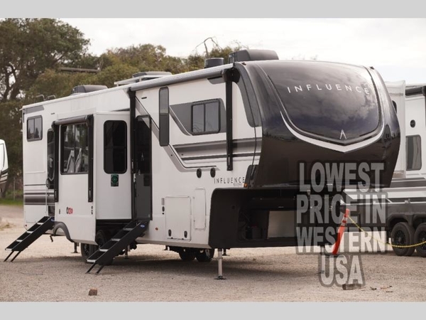 Any Grand Design Influence fifth wheel features five-sided aluminum cage construction with a walk-on roof and a fully enclosed underbelly with heated tanks and storage for all weather camping. For peace of mind, the MORryde CRE3000 Suspension system will provide safe and smooth towing, and the 101" widebody construction offers all the room you need and that is before multiple slides are fully engaged. You will appreciate the Keyed-Alike locks, slam-latch baggage doors with magnetic door catches, exterior security light, and SolidStep entry steps. On the inside, Congoleum flooring, premium roller shades for privacy, a hallway handrail for safety, and nightstands with USB ports to keep all of your electronics fully charged. You will also love the on demand tankless water heater when showering, plus the added heat and ambiance from an electric fireplace, and so much more!