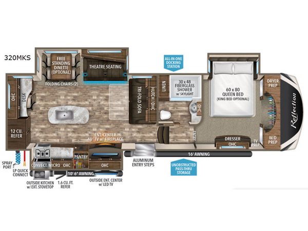 If you need to work while away from home, and enjoy cooking outside while watching TV, this Refection 320MKS is perfect for you! Just imagine cooking on the outdoor kitchen under the second awning while visiting with other campers. If you have to work, the desk in the rear of the fifth wheel is quite convenient. Your spouse can cook in the gourmet kitchen inside with a center island and large sink while planning your afternoon adventures until you are finished working. You will find plenty of storage throughout for hanging clothes, blankets and such in the drawers or overhead cabinets, plus there is an exterior unobstructed pass-through compartment that allows you to store larger items. So if you enjoy playing while working, this model allows you to do both in the great outdoors!