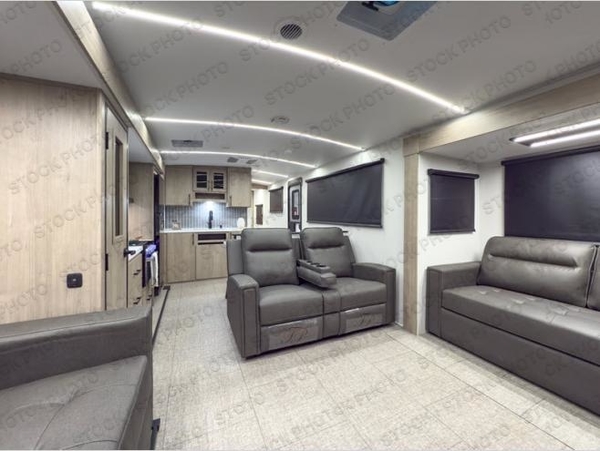 The rear living room on this Imagine travel trailer is just what you'll want when you're looking for a little down time. This room has opposing tri-fold sofas within slides, theater seating, and a TV. Another place that you can sit down at is the free-standing adjustable dinette. You can sit here with a fresh cup of coffee in the afternoon as you map out your hike for tomorrow. The kitchen offers you a flip-up countertop extension, a microwave, a three-burner range with oven, a 10-cubic foot 12V refrigerator, and pantry to help you make meals, and there is a private bedroom with a 60" x 80" bed to rest on at the end of the day.