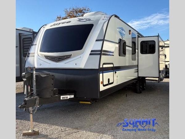 This White Hawk travel trailer is the perfect addition to your next family fun adventure because of the comfortable and quality amenities it provides. In this trailer you can prepare dinner the way you are used to doing with the residential-sized appliances included in the open-concept kitchen. The 3-burner range top and 8 cubic foot refrigerator are what take this unit from feeling like a trailer to feeling like a home. Small details, such as the decorative kitchen backsplash and arched ceiling, give bold elegance to the design of this model. Located in the front private bedroom is a Jayco-exclusive Simmons mattress which will allow you to sleep as peacefully in this trailer as you do in your own home.