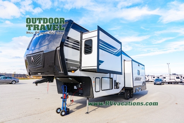You can enjoy a spacious rear living area in this RV with dual opposing slides offering you entertainment, kitchen amenities, seating and windows for great views! The rear tri-fold sofa also converts into extra sleeping space for an extra guest or two, just like the booth dinette does. Yet you might like to add the swivel dinette option. There are theater seats to enjoy while you place your drinks in the cupholders and watch the entertainment center with a 40" LED HDTV and fireplace. The pantry is big enough to store your favorite snacks, and the kitchen island will make meal prepping easier, plus there is a 16 cu. ft. refrigerator to store any leftovers. The full bathroom has a 30" x 48" fiberglass shower and a linen closet to store your towels. The front private bedroom has a comfortable queen bed slide that can be switched out for the optional king bed, a dresser with overhead cabinets, and a full wall wardrobe that is prepped to add the optional washer and dryer so that you can extend your camping trip with clean clothes!