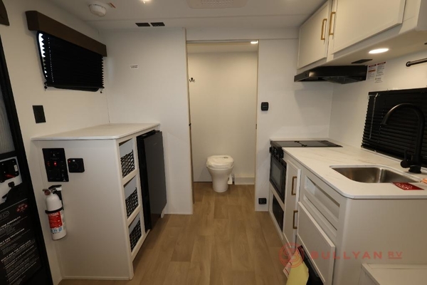 Travel in this 131DL model and step inside through the sturdy aluminum entry steps and you'll be greeted by a versatile 60" x 80" Murphy bed that doubles as a comfortable seating area during the dayperfect for relaxing with your furry companion, thanks to the included pet dish. In the center, the kitchen offers all the essentials for preparing a delicious meal, featuring a microwave, 2-burner range, 3.3 cu. ft. refrigerator, and overhead cabinets for added storage. At the rear, enjoy the convenience of a full bathroom complete with a walk-in shower and foot-flush toilet, making life on the road both comfortable and functional.