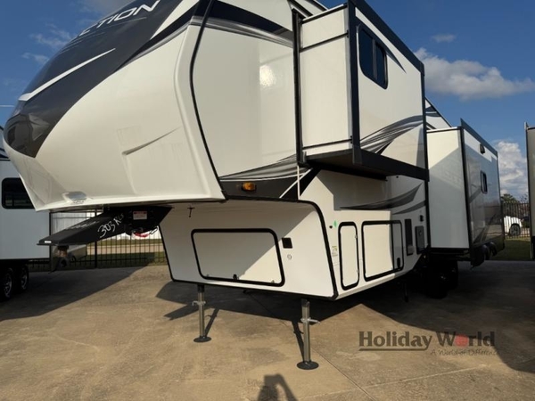 Whether you travel for pleasure or work, you will love the spacious main living and kitchen area with a rear tri-fold sofa that doubles as extra sleeping space, and the theater seating directly across from the entertainment center with a 40" LED HDTV and a fireplace below. The kitchen island will make meal prepping and drying the dishes easier and the hutch is the perfect place to place your picture frames, nice dishes, and extra cooking items. There is even a pantry that is big enough to store all of your favorite snacks, dry ingredients and such. Outside you can enjoy two electric awnings that provide protection from the elements as you relax and visit with other RVers, and your camping chairs can easily be stored in the pass-through compartment. The double entry bathroom is convenient especially at night when you can slide the door to enter from the front master bedroom. You will find plenty of storage for your clothing and gear, plus the bedroom slide out gives you drawers and linen storage that stretches into the full bathroom.