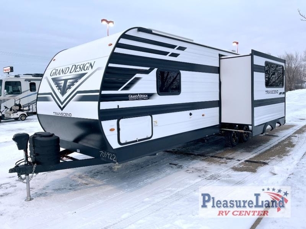 With any Transcend travel trailer by Grand Design, you will enjoy upscale appointments and convenient amenities to make each camping experience one to remember! The Quad Seal technology, residential insulated walls, plus heated and enclosed underbelly with suspended tanks make these units solid and durable. There is a black automotive glass door outside, along with a Safe-T-Rail assist on the main entry door, backup camera prep, and a universal docking station. JBL interior and exterior speakers plus a JBL head unit will let you listen to your favorite tunes as you visit under the power awning with LED strip lights. Inside, you'll enjoy multiple outlets to keep your gadgets charged, thermoformed and seamless countertops, and a 6' 6" interior height so you won't feel closed in. The Solar Prep Package will allow you to enjoy off-grid capabilities with a 200W solar panel, which is wired for up to 600W, a 30 AMP Bluetooth solar controller, a 2000W inverter prep, and more!