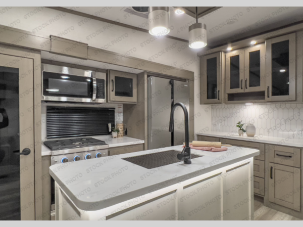 You can enjoy a spacious rear living area in this RV with dual opposing slides offering you entertainment, kitchen amenities, seating and windows for great views! The rear tri-fold sofa also converts into extra sleeping space for an extra guest or two, just like the booth dinette does. Yet you might like to add the swivel dinette option. There are theater seats to enjoy while you place your drinks in the cupholders and watch the entertainment center with a 40" LED HDTV and fireplace. The pantry is big enough to store your favorite snacks, and the kitchen island will make meal prepping easier, plus there is a 16 cu. ft. refrigerator to store any leftovers. The full bathroom has a 30" x 48" fiberglass shower and a linen closet to store your towels. The front private bedroom has a comfortable queen bed slide that can be switched out for the optional king bed, a dresser with overhead cabinets, and a full wall wardrobe that is prepped to add the optional washer and dryer so that you can extend your camping trip with clean clothes!