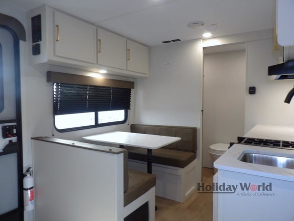 This is the perfect couple's trailer with versatile seating and sleeping space! You'll find a queen-size Murphy bed up front with storage space beside and above plus a full rear bath for added privacy. Once you've made lunch in the full kitchen, you can dine at the booth dinette or take your plate outdoors to sit under the 10' power awning. You'll also find pass-thru storage outside that will be perfect for fishing poles, lawn chairs, tools and more!