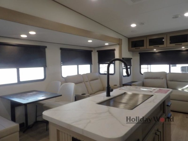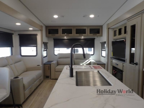 Get ready to enjoy everything the campgrounds and surrounding area has to offer when you are setup to camp in this fifth wheel! The two electric awnings offer protected areas creating outdoor living spaces; just grab your camping chairs from the unobstructed pass-through storage. And the interior offers a spacious living area and kitchen combination with dual opposing slides for maximum space. You can sit on the tri-fold sofa or the dinette to lounge back and rest after a day of adventure. The hutch and kitchen island offer counter space to prepare and serve meals, and there is a large pantry for goodies. The 40" LED HDTV with a fireplace below provides entertainment before bedtime or on a rainy day. And the front bedroom offers privacy, a walk-around queen bed, and plenty of storage!