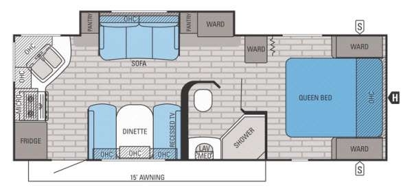 As you enter the 24RKS travel trailer, you will be in the kitchen area. There is a refrigerator, three burner range, microwave, and double kitchen sink. The slide has a pantry, sofa, pantry, and wardrobe. On the opposite side you will find a dinette with a recessed TV above the dinette.