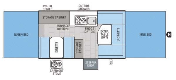 Stepping inside the camper, to the left there is a storage cabinet and a dinette. On the opposite side of the camper you will find a large storage cabinet with an optional furnace below. The kitchen area has a two burner range and sink with an optional refrigerator. Along the front of the camper you will find a u-dinette with an optional extra table.
