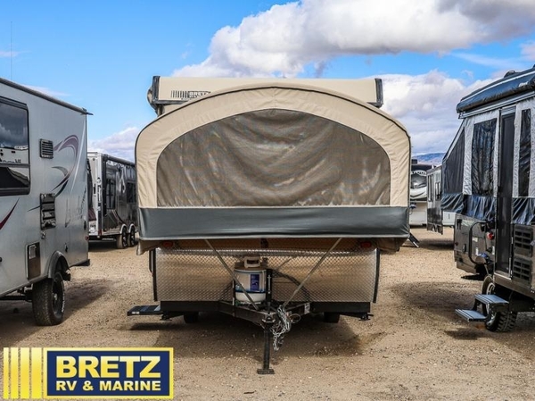 The Jay Series 1207UD folding pop-up camper offers a rear queen tent bed and a front king tent bed.