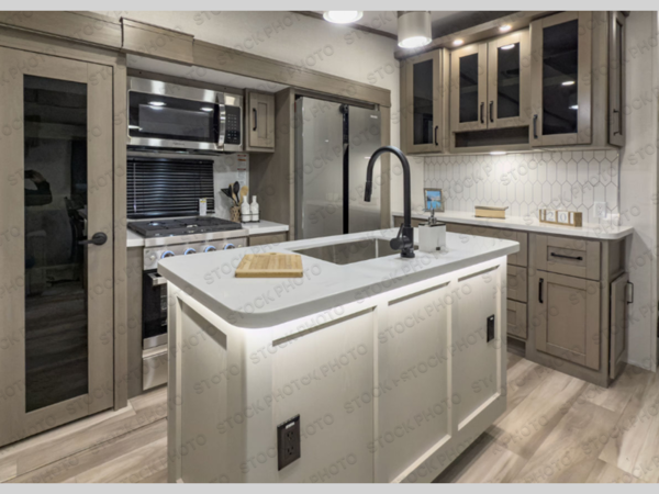 Whether you travel for pleasure or work, you will love the spacious main living and kitchen area with a rear tri-fold sofa that doubles as extra sleeping space, and the theater seating directly across from the entertainment center with a 40" LED HDTV and a fireplace below. The kitchen island will make meal prepping and drying the dishes easier and the hutch is the perfect place to place your picture frames, nice dishes, and extra cooking items. There is even a pantry that is big enough to store all of your favorite snacks, dry ingredients and such. Outside you can enjoy two electric awnings that provide protection from the elements as you relax and visit with other RVers, and your camping chairs can easily be stored in the pass-through compartment. The double entry bathroom is convenient especially at night when you can slide the door to enter from the front master bedroom. You will find plenty of storage for your clothing and gear, plus the bedroom slide out gives you drawers and linen storage that stretches into the full bathroom.